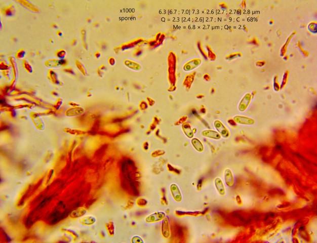 Spores 6.8 x 2.7 mu, hyaline, ellipsoid with two drops.