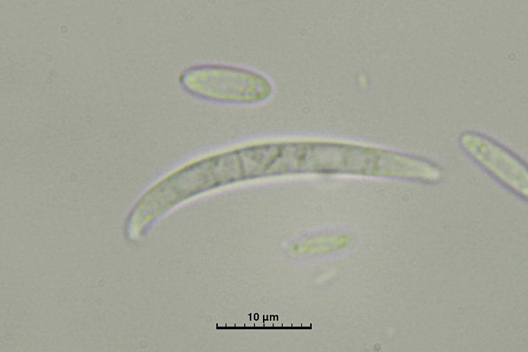 There are two kinds of spores: narrowly elliptical - cylindrical 8 - 12 x 2.5 - 3.5 ?m and septate, crescent-shaped 28 - 34 x 3 - 3.5 ?m.