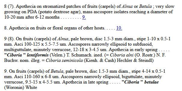 C. betulae hase slightly fusoid, warted spores and lacks croziers. It grows on seeds instead of catkins.
