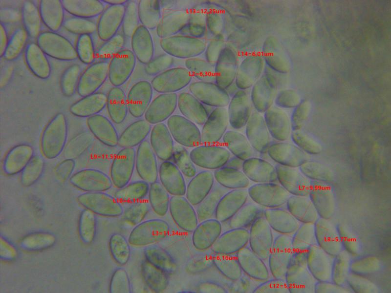 C. betulicola has indeed smaller spores, e.g. in Elliott 1973. In my folder there is one with living spores of8,2 - 9,4 x 3,6 - 4,7 µm.