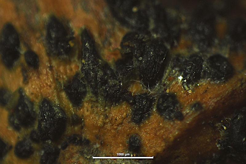 These 0.5 mm diam. acervuli were breaking through