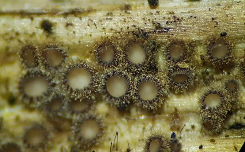 Hello (again :) ),On old stem of Urtica I saw these asco's. Brown hairs with whitish material (at first thought of parasitic fungi). Hymenium whitish, apothecia small: max 0,5 mm.