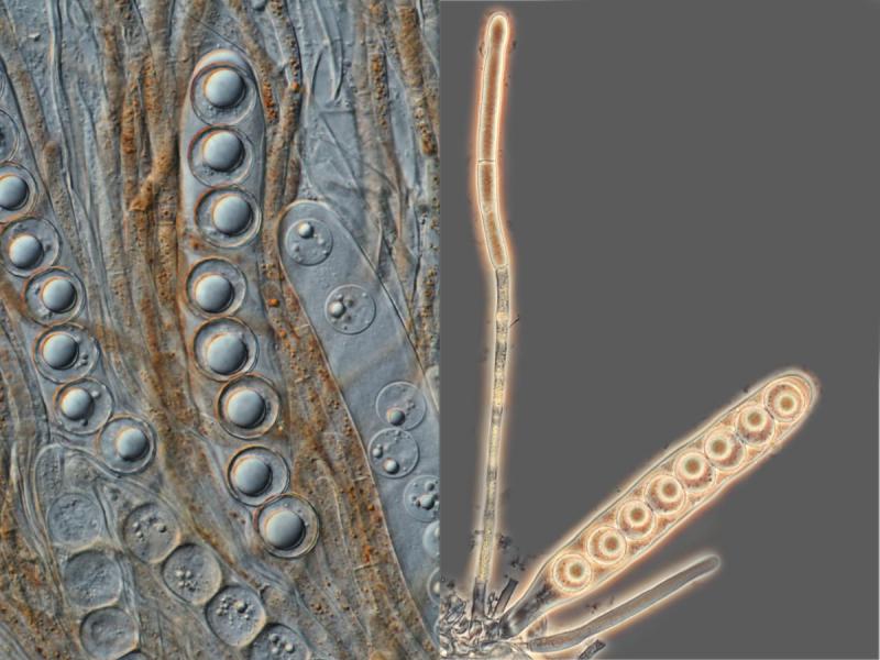 Bild 3: links Hymenium im DIC; rechts Asci und Paraphysen im Phasenkontrast.