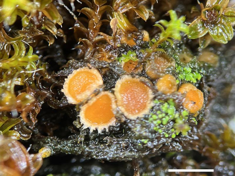 Bild 2: Die Fruchtkörper liegen tief im Polster in Gruppen oder einzeln. Die Fruchtkörper sind feucht mit einem Durchmesser von ca. 2mm.