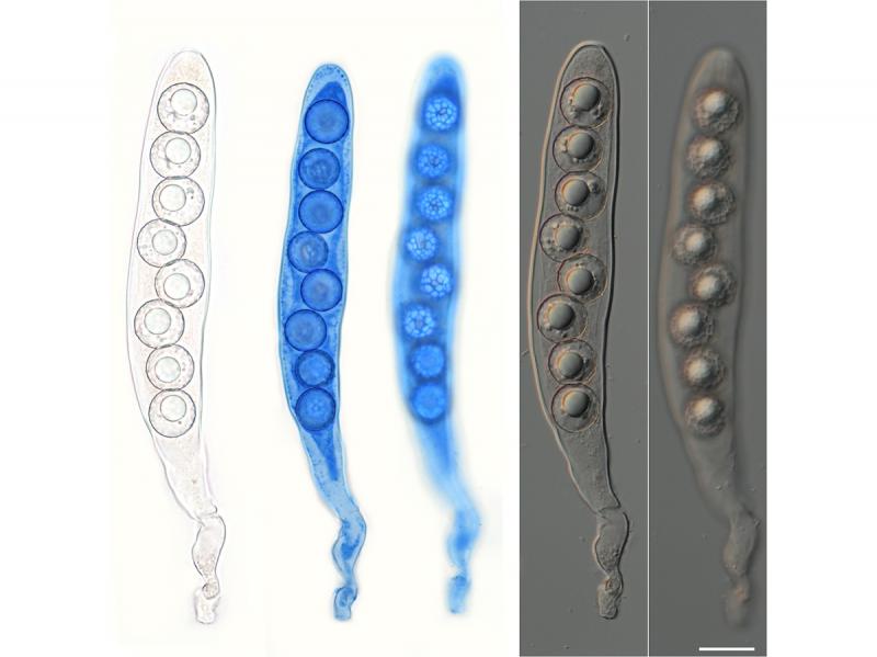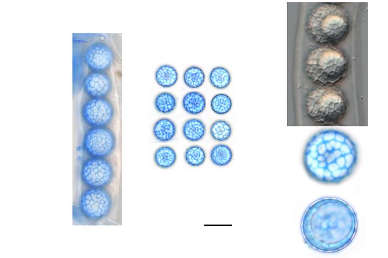 Die Sporen sind einreihig im Asci angeordnet, sie sind rund und haben in der Regel 1 grosser Oeltropfen. Die Oberfläche ist mit einem feinen, unregelmässigen Netz überzogen, dieses Netz lässt sich mit Baumwollblau anfärben, die Höhe der Ornamentation beträgt wohl ca. 0,5µm. Bei meiner Präparation zeigten sich die Sporen als sehr zart und Druckempfindlich.