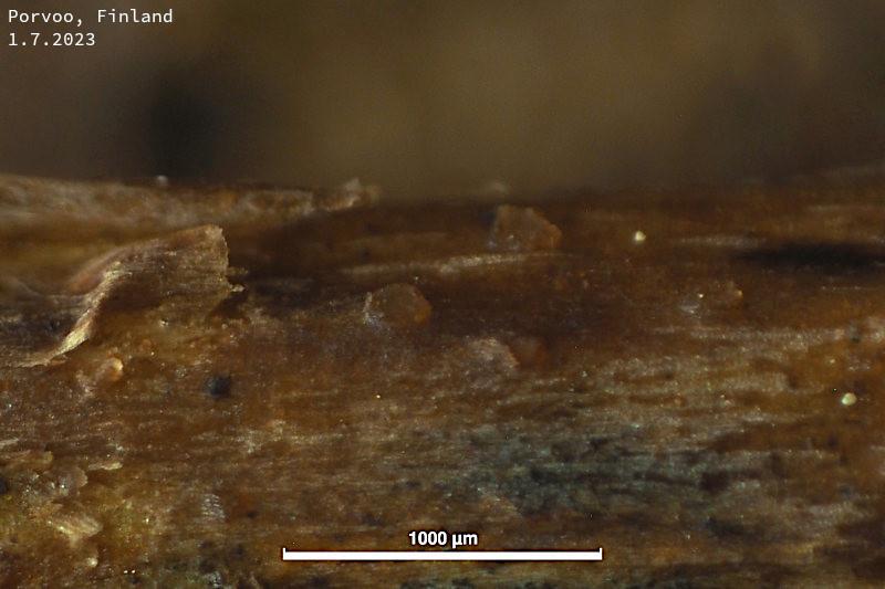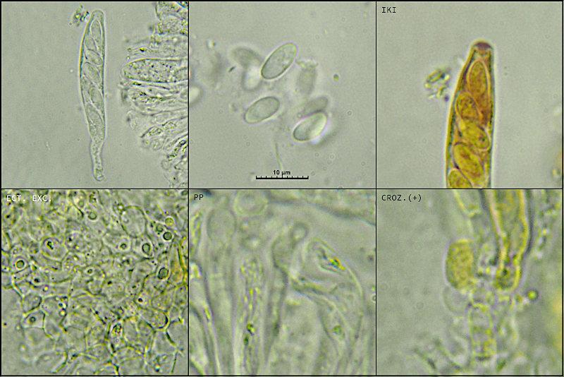 Asci 8-spored, IKI+(r), croziers present. Paraphyses were difficult to observe, but at least some of them appeared to be narrowly cylindrical with an irregular tip. Exctal excipulum seemed to be of textura angularis.