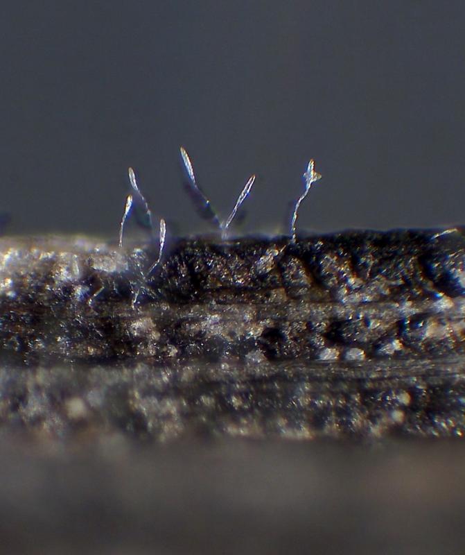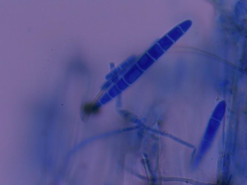 Single with a single conidia at the tip, hyaline, unbranched, total height 100-150 µm. Conidiophore septated, approx. 2 µm wide. Conidia clavate to fusiform, 3-10-septated, 40-79 x (6.5)-(7)-8-(9), n=18.