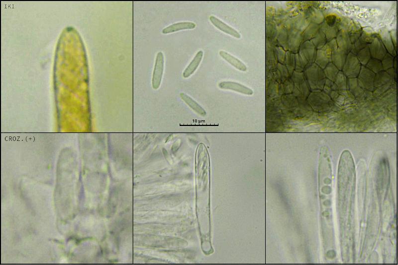 Asci 8-spored, with croziers, IKI+(bb). Paraphyses rather wide, with low-refractive guttules. Spores 8.9 - 9.8 × 1.8 - 2.2 µm.