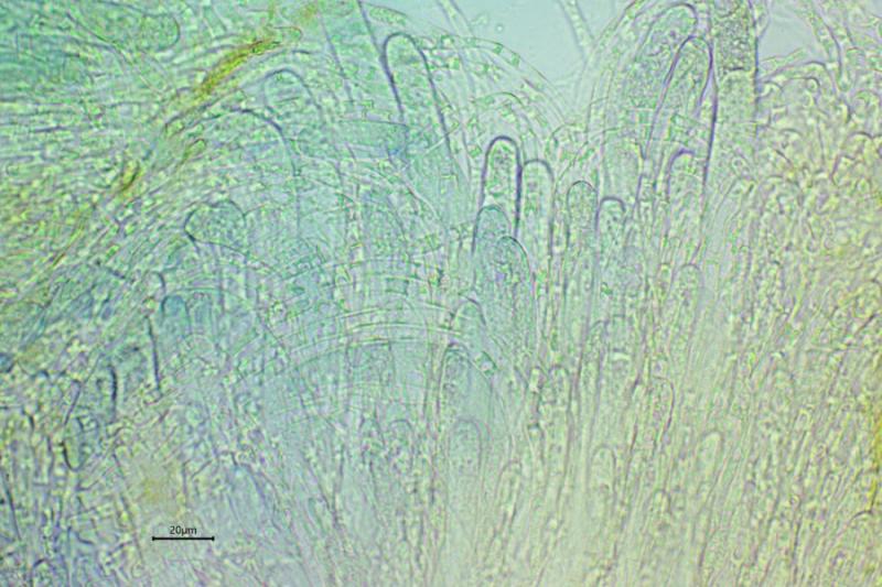 Medullary excipulum with text. globulosa, text. inflata, ectal excipulum text. globulosa with some pyriform cells or inflated hyphae.