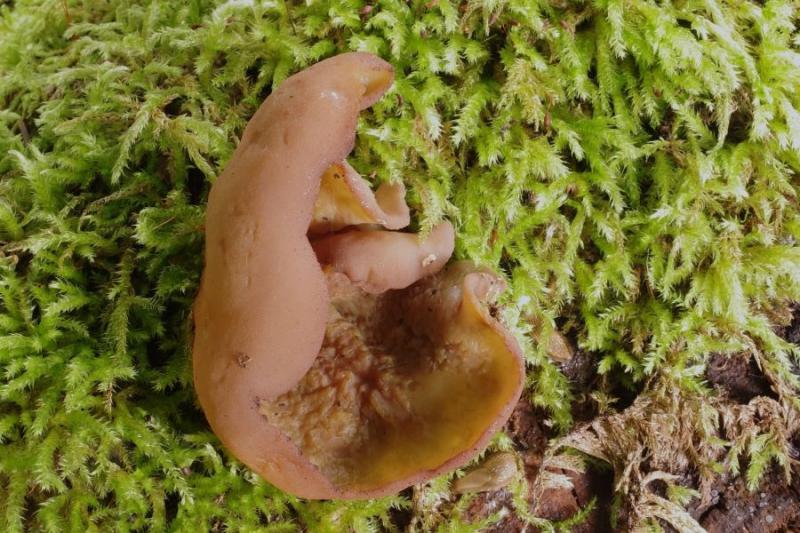 Apothecia solitaire, the largest one up to 80 mm on average (it wasn't mature anyway, no sporeprint), mostly undulate. Hymenium deep yellow and outside pinkish (colours similar to e.g. Paragalactinia micheli but inverted), fine pustulate. No milk after damage, but yellow pigments clearly present.