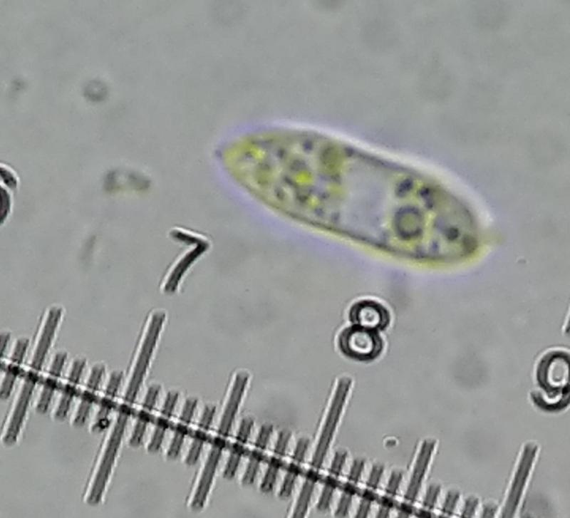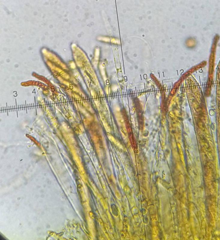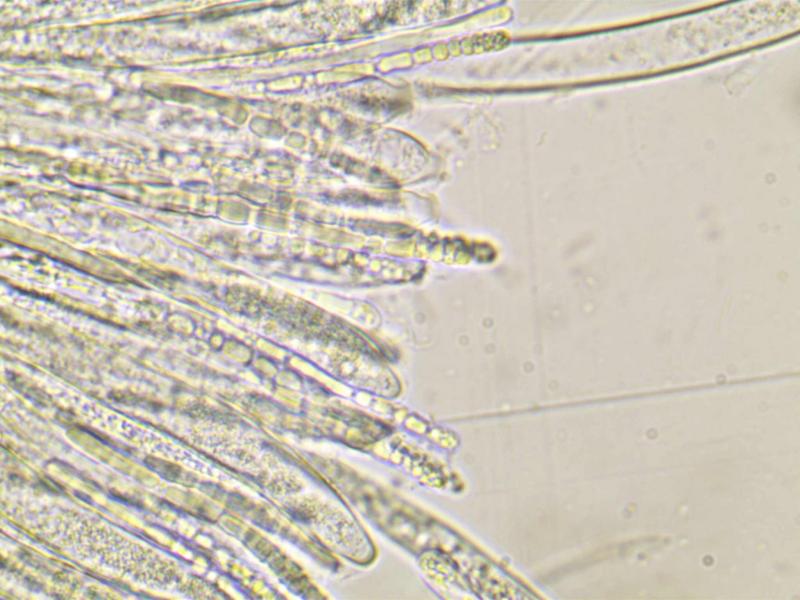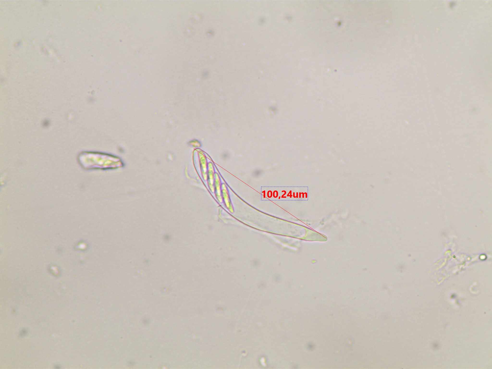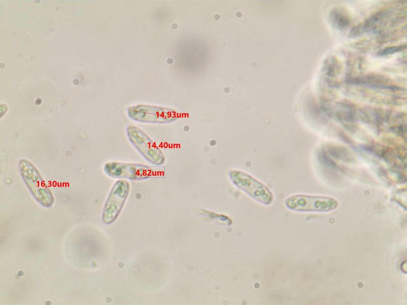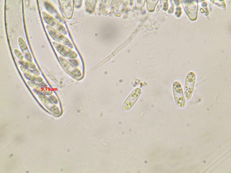 Spores non scutulloides (ou à peine): 14-16 X 5 µ. OCI = 5. Quelques gouttes moyennes et nombreuses petites aux extrémités