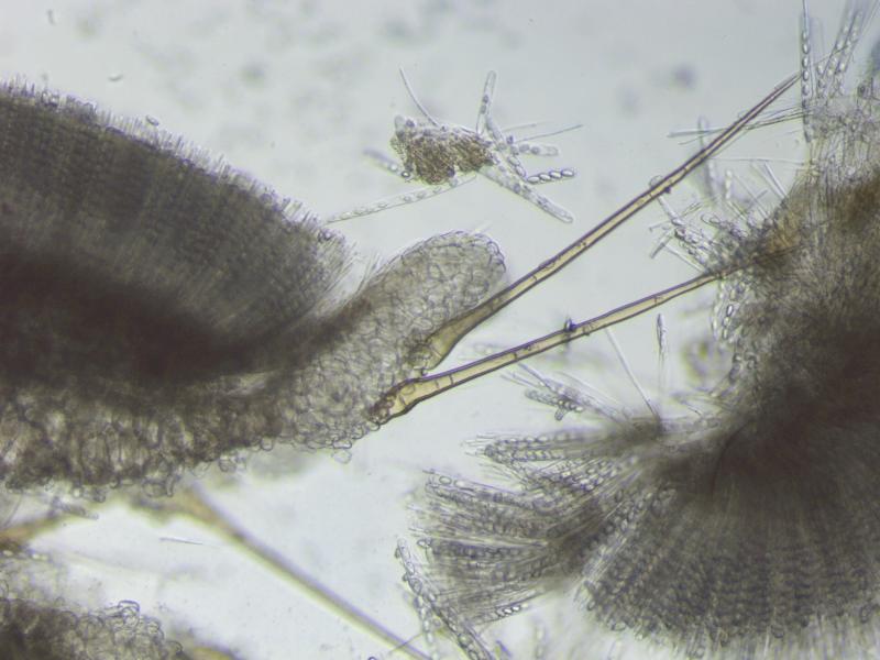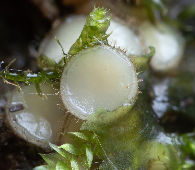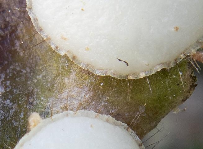 Numerous apothecia, up to 4 mm diametar, white, with conspicuous margine, hairs sparse