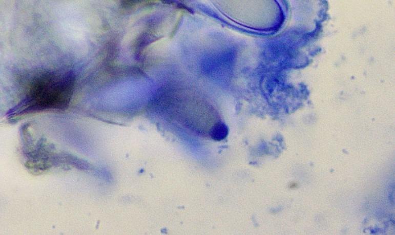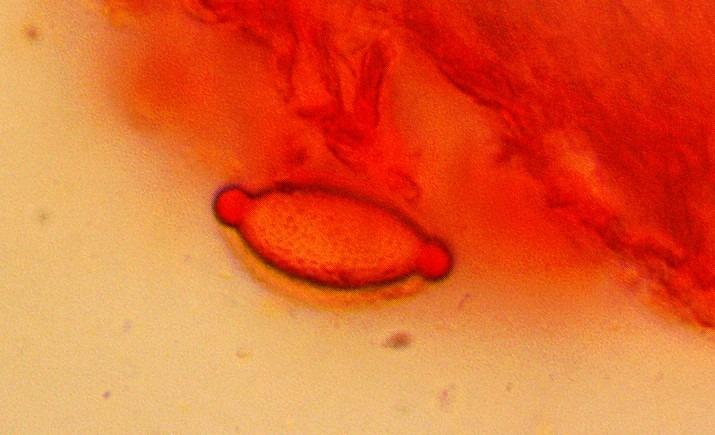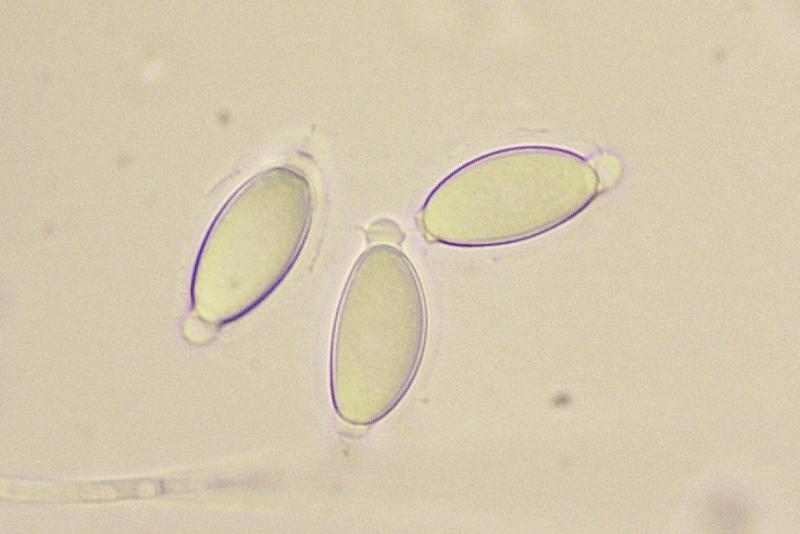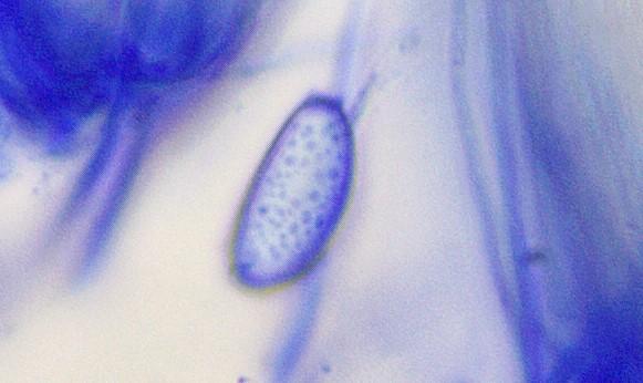 Spores ellipsoid and (quite a lot of them) amygdaliform, with cyanophilous and congophilous collarettes. In CB and CR verruculose. 17,9 x 8,8 Q= 2,03.