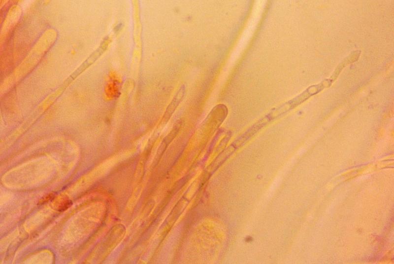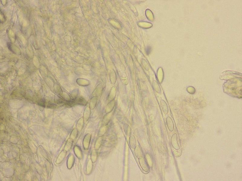 Asci cylindrical, quite narrow, 8-spored. 195-218 x 14-15, operculate, amyloid.Two types of paraphyses, both exceeding the asci: