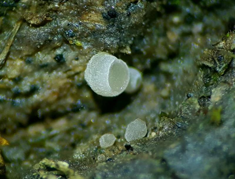 Hello,On cowdung I found these. Fb white, "sugarcoated", sessile, starting conical but then with broadened apex with hymenium sinking which makes it a bit cupshaped. No hairs, around 1 mm.