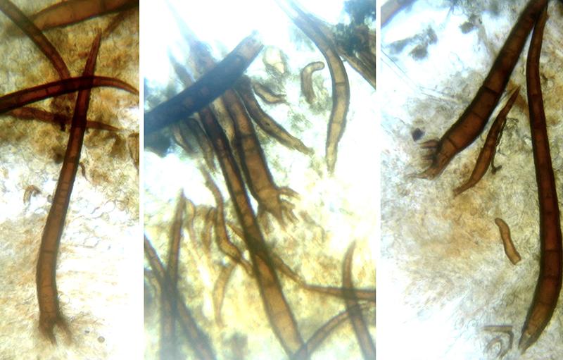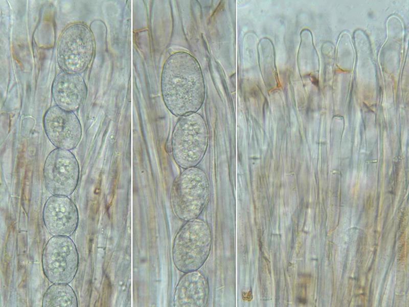 I think this Scutellinia is different from any I've seen so far. It most closely matches S. olivascens, except for the substrate because it did not grow on the ground but on the bark of a tree. Otherwise, it is very large, about 1 cm in diameter. Spores are 20-25.6 x 13-16 µm. Hairs 200-750 µm.