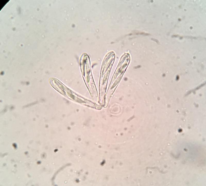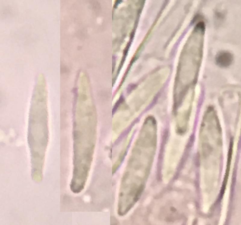 Spores fusiform, usually with one acute end and on rounded end, somewhat curved, 9.5-15.1 x 2.2-2.9µm