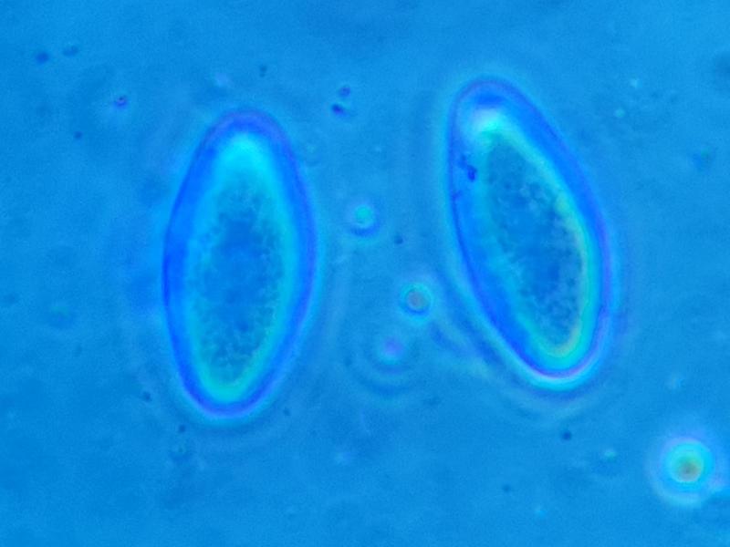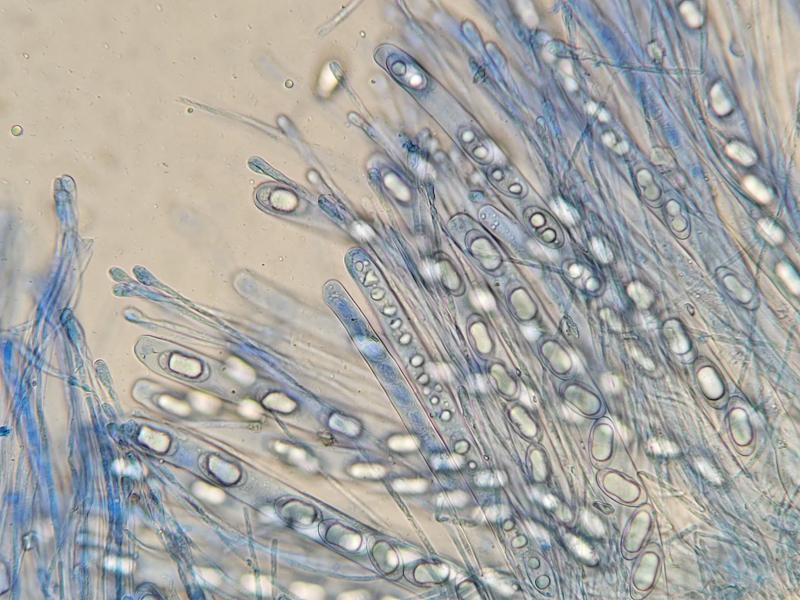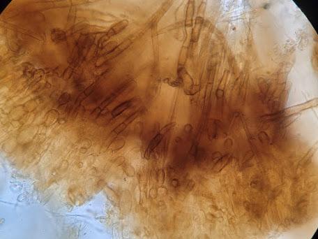 Can my collection be confirmed as P. carneosanguinea from these pictures? I add a couple of spore pics in cotton blue which I think show the very fine warts? Unfortunately I only have dried material, perhaps that is why I can not see the pigment in the paraphyses.