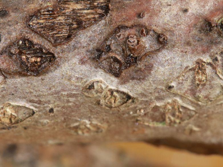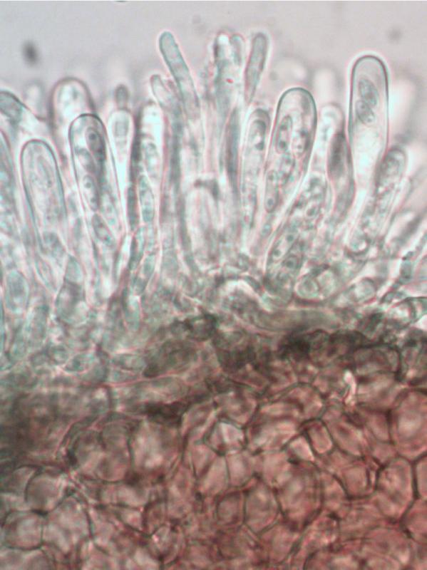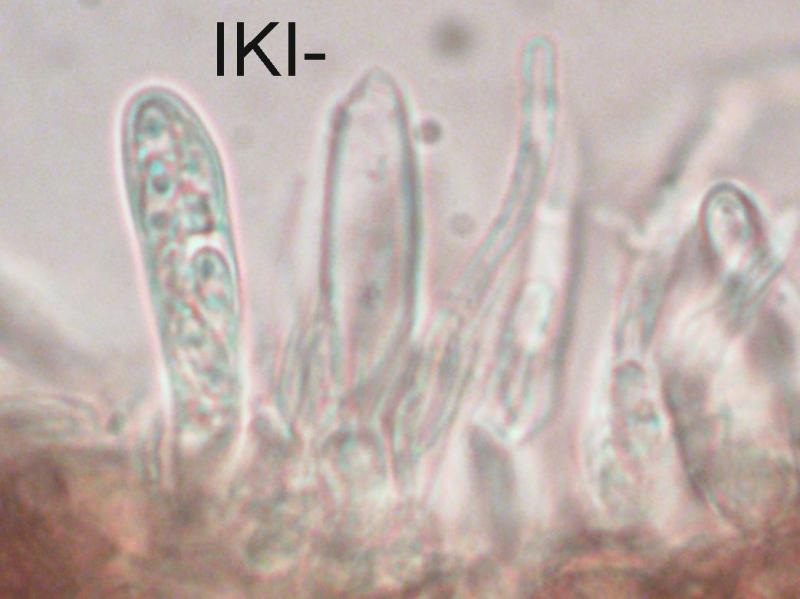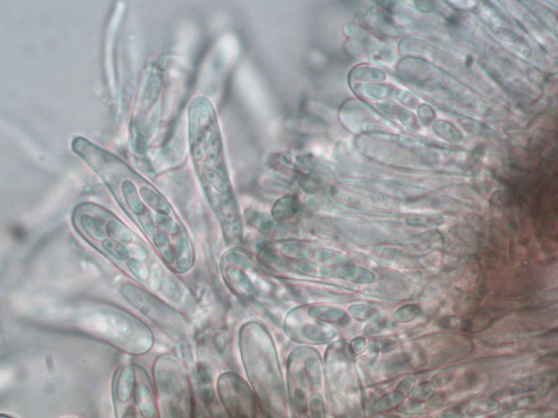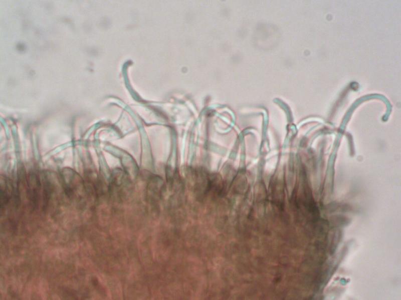 I don't even get to the genus with this tiny ascos. On a Fraxinus twig, the size is about 1 mm. The hair-like elements on the outer side are characteristically slender, smooth and bended. The excipular layer is red, made of rather angular cells. Asci small, base not hooked, clearly inamiloid (tested with lugol). Spores smooth and hyaline, 6,5-7,5x2,6-2,8 um, with two developed droplets. Paraphyses simple, without guttulation.