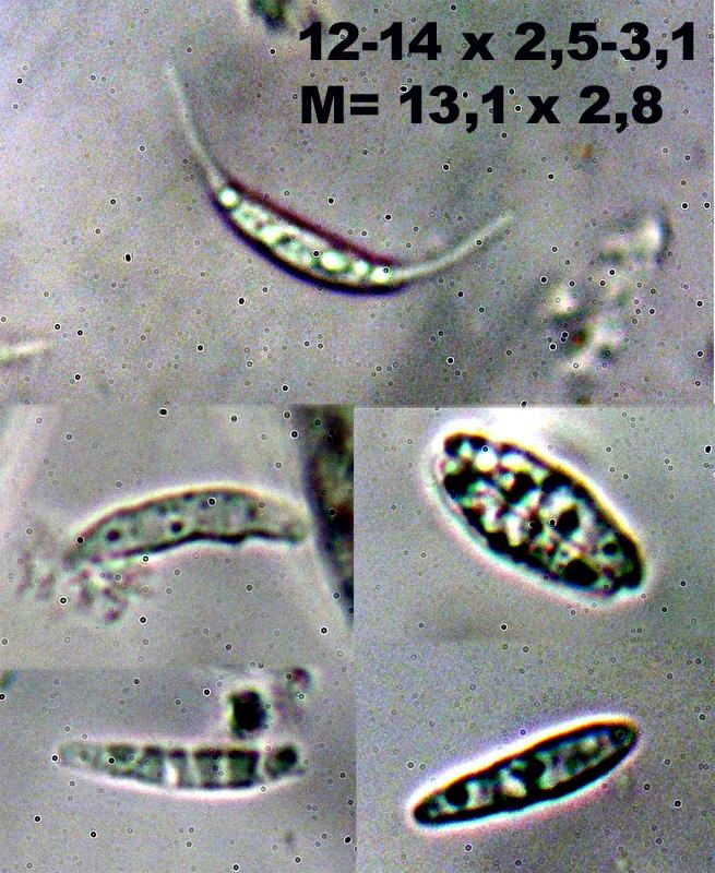 The three lower narrow spores are probbaly the correct ones. A Pezizellaceae, perhaps Calycina. In dead state impossible for me.