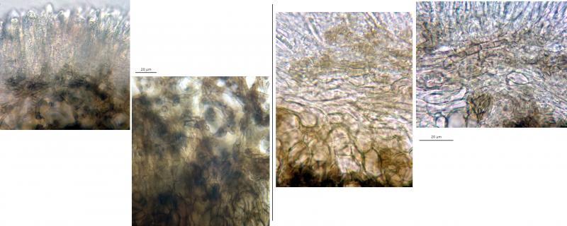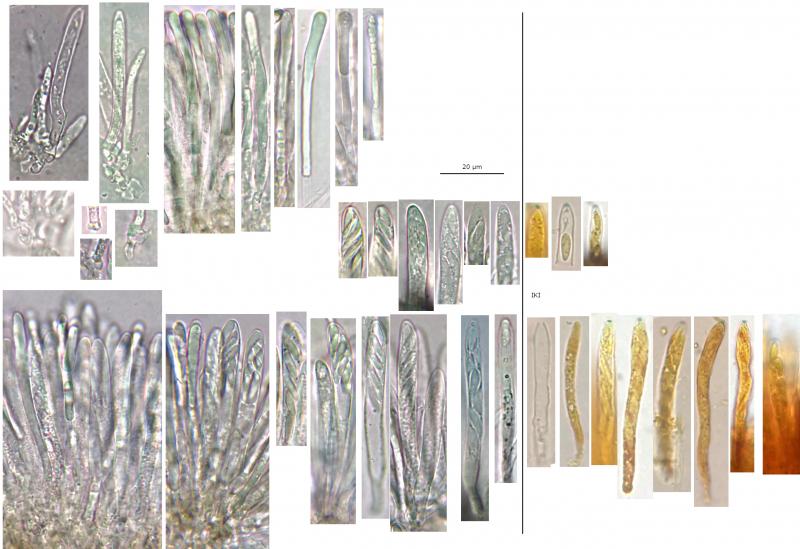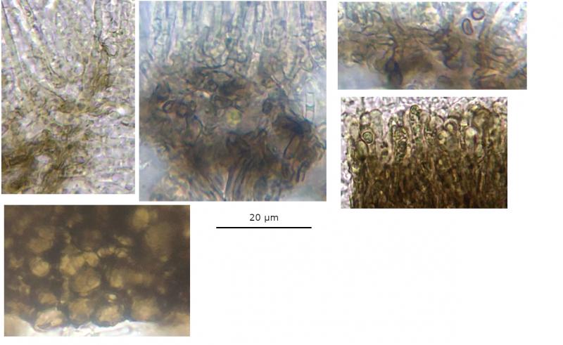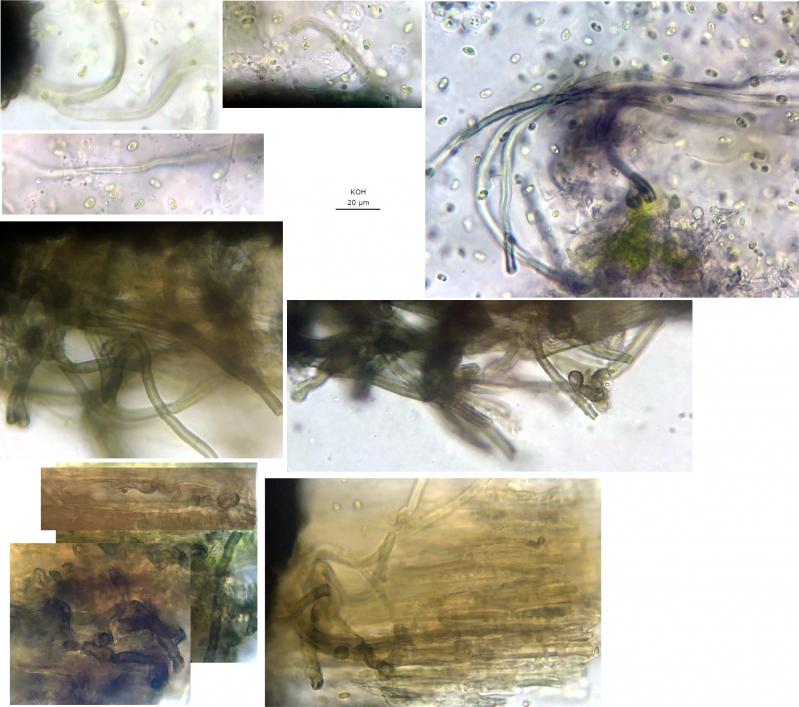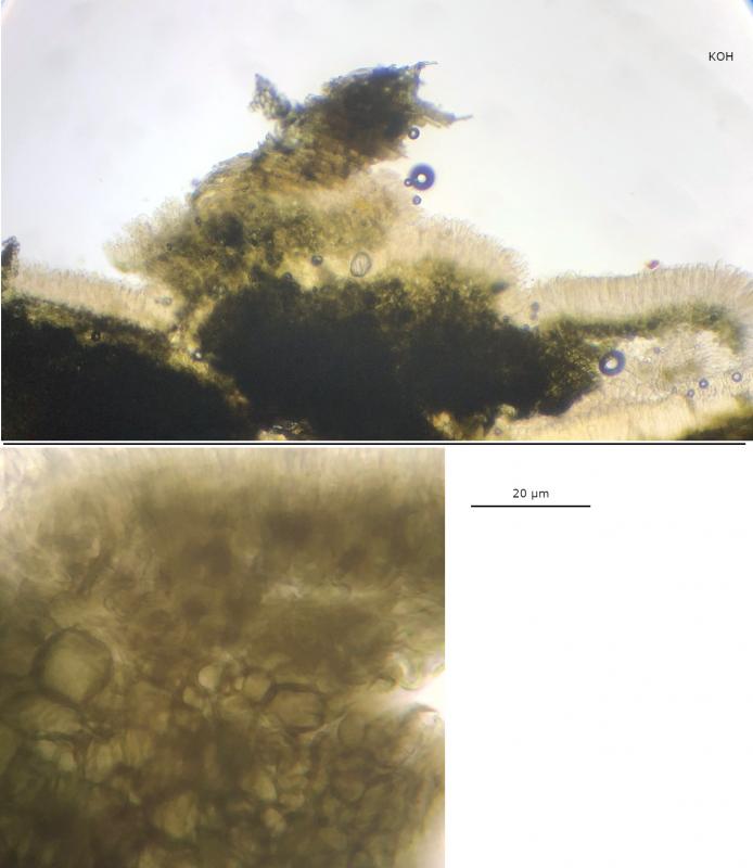 KOH: Ectal excipulum more brownish-olivaceous in thin sections, maybe a similar reaction in subhymenium, no reactions from hymenium.