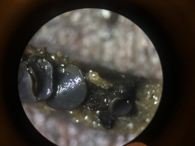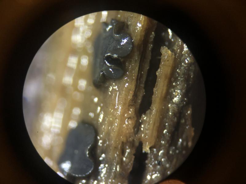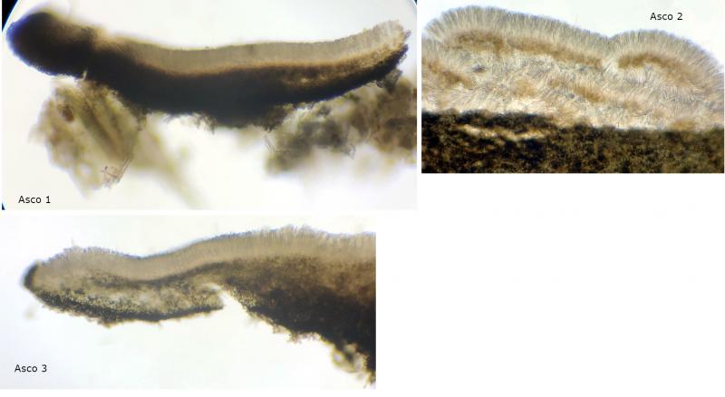 Preparation: Three ascomata from the middle rail examined microscopically, the first ascoma was stored for several days (in a damp container) prior to examination, but the following two were collected later and examined within hours of collection, water was used to mount unless otherwise stated.