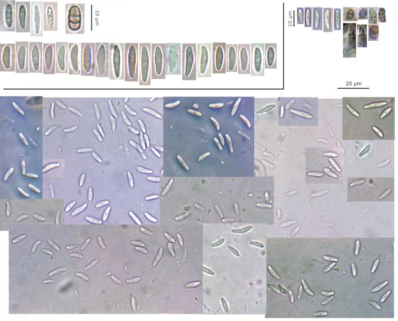 Spores: Cylindrical to more allantoid or fusiform, occasionally narrowly-clavate, occasionally narrow-end slightly curved, inequilateral in profile view, aseptate, nucleus often visible, occasionally a few tiny shadowy LBs towards poles, OCI 0 (- 1).