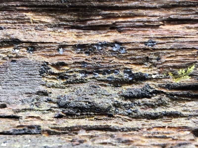 Habitat: Observed twice in January, gregarious to clustered, on decayed wooden fence rails, unidentified deciduous wood, top (more exposed) and middle rails of fence, ~0.5 – 1.25 m from the ground, presumably xeric, top and bottom sides of rails, decorticated parts, often in depressions and crevices, next to a pond in mixed deciduous woodland, southern England.