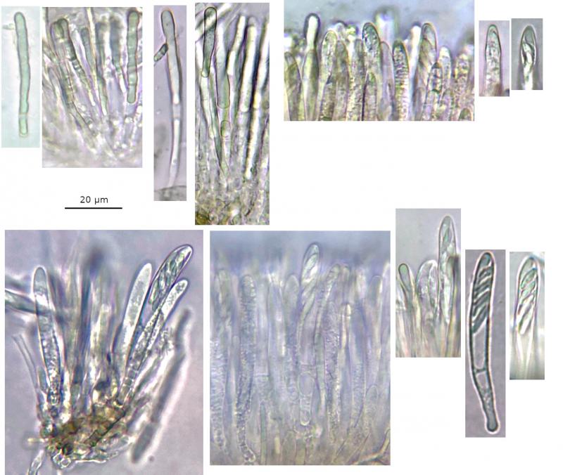 Associated: Some ascomata parasitised by intra-hymenial Chytridomycete sp., evidenced by many sporangia appearing like asci in the hymenium, significantly supressing the host asci, and some motile zoospores ejected in water mount (see http://www.ascofrance.com/forum/77885/some-very-swollen-asci-on-a-suspected-mollisia-sp).