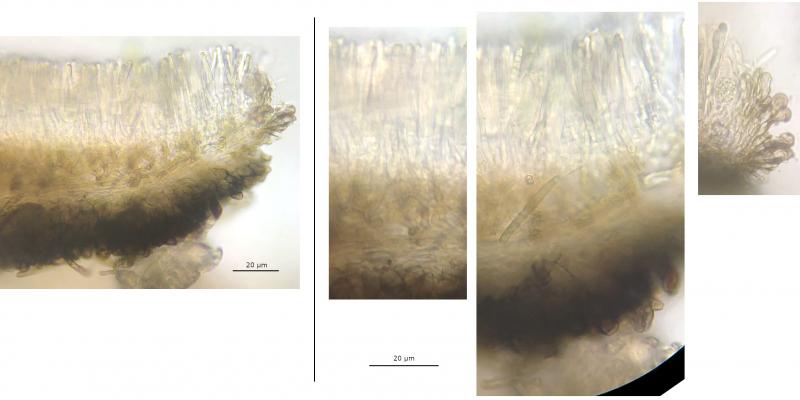 Hymenium: Ochraceous en masse, no epithecium/exudate or gelatinous matrix identified.