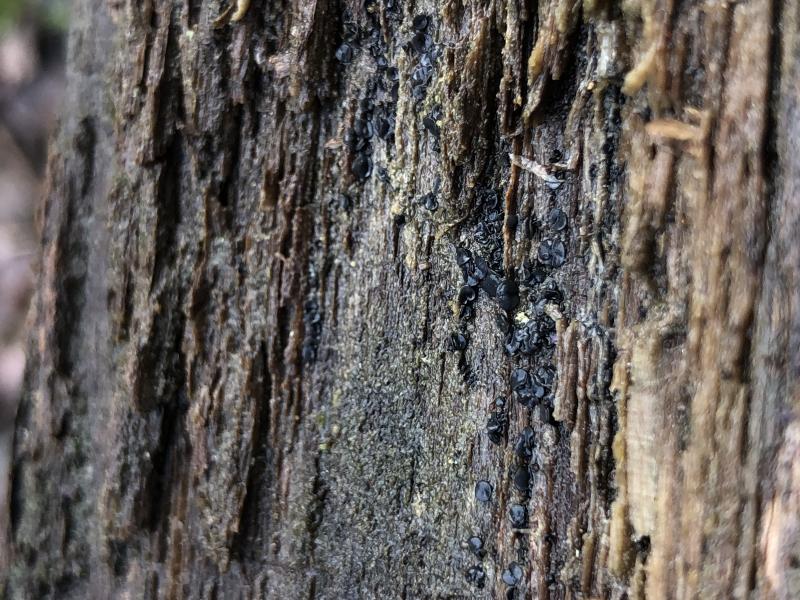 Subiculum appears to be part of an algal and dematiaceous biofilm that is visible on substrate around many ascomata, small/young thalli of lichens and bryophytes close by, tiny orange ascomata from an Orbilia sp. (indistinct macromorphology) also on the middle rail, basidiomata of Stereum cf. hirsutum on other corticated rails.