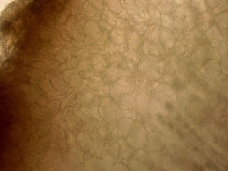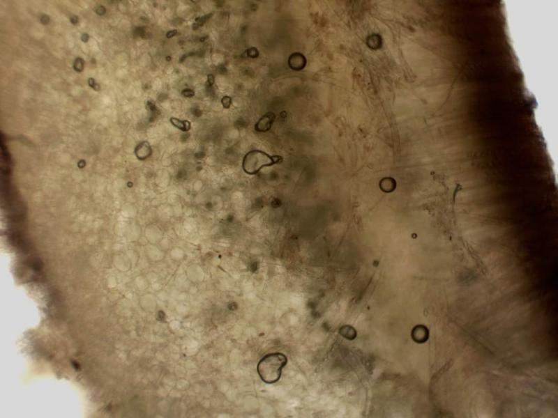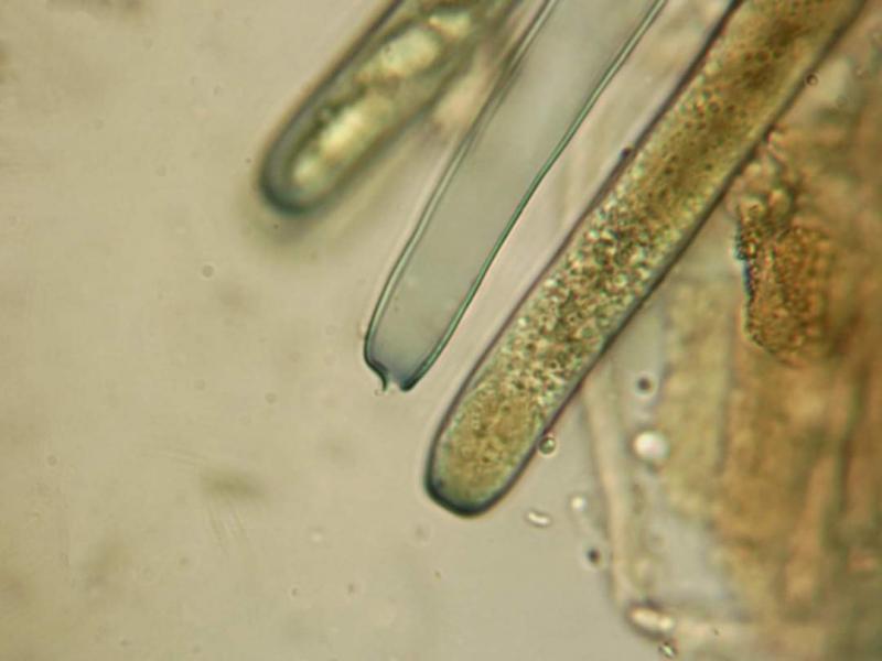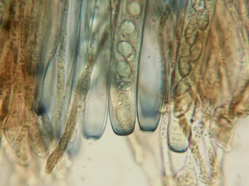 Diagnóstico Apotecia cupulata violaceo-vinosa: Methuen 12 F5, 1–2 cm lata. Excipulum clarius aurantio vel luteo brunneum: Methuen 5 C6-7-8 - E6-7-8. Caro parum crassa, fragilis, lactifera; látex albus lutescens. Subhimenio: textura globulosa angulari, spissum de 50 µm. Excipulum medullare superum: textura intricata, 160 µm. Excipulum medullare inferum: textura globulosa, celulis globosis 35–50 µm; 500 µm spissum, lactiferum. Excipulum ectale: textura angulari, 150 µm spissum. Ascas 320–350 × 12–14 µm aporhynchi jodo caerulescentes, J+. Sporae ellipsoideae, uninucleatae, uniguttulatae, verruculis vel subreticulo ornatae: (14)15–16(17) × (8,5)9(9,5) µm. Paraphyses septatae, in medio ramosae, alte ad apices usque ad 11 µm incrassatae, saepe loculosae, granulis viridis vel brunneo-luteis praeditae. Typus in herbario nostro MARZO - JCD, sub n° 853-75, La Gélade, Aubagne (Francia 13): 20.11.75, Pinus halepensis.