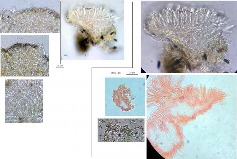 Marginal hairs: Hyaline, short, cylindrical (to lageniform?), crystallised, no ornamentation?, apex rounded, appear 2 – 3 septate.