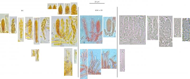 Preparation: Stored for a day in a damp container attached to wood, slides prepared from two ascomata, sections attempted but only some success with second ascomata, progressively squashed, mounted in tap water or KOH with IKI or CR applied afterwards.