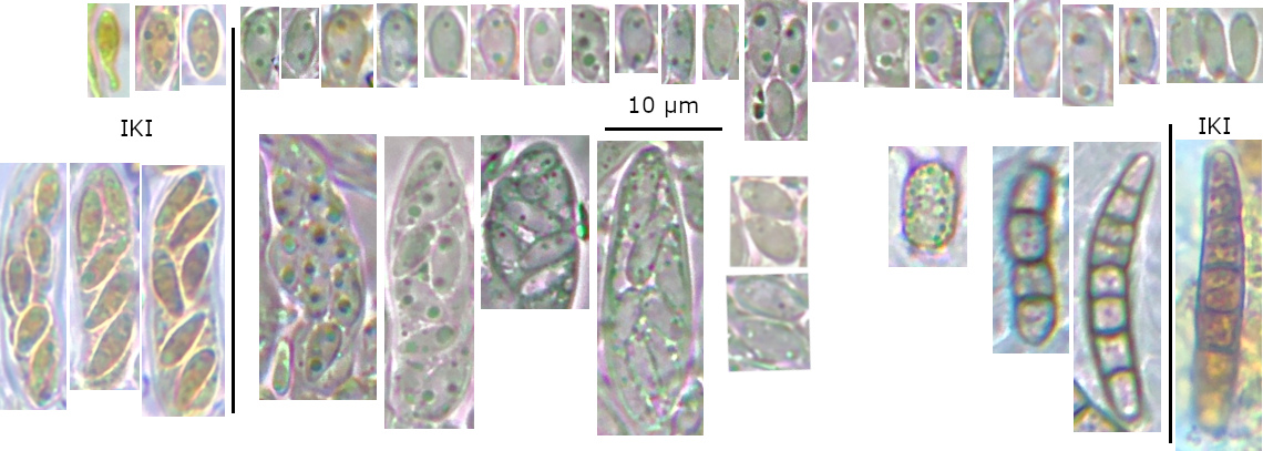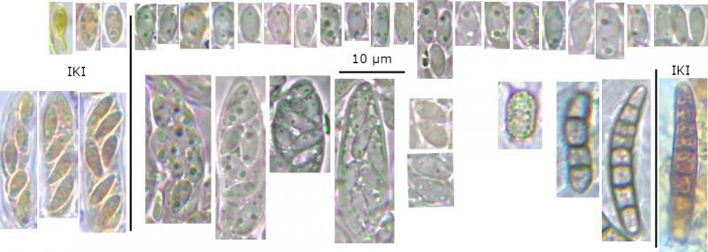 Spores: Ellipsoid-ovoid, often inequilateral in profile view, occasionally heteropolar?, usually multi-guttulate, 1 (- 2) medium-size and several smaller LBs towards each pole, OCI 1 - 3, no septa identified.