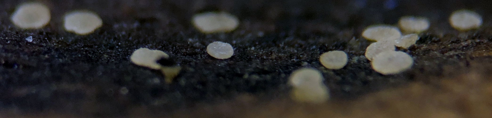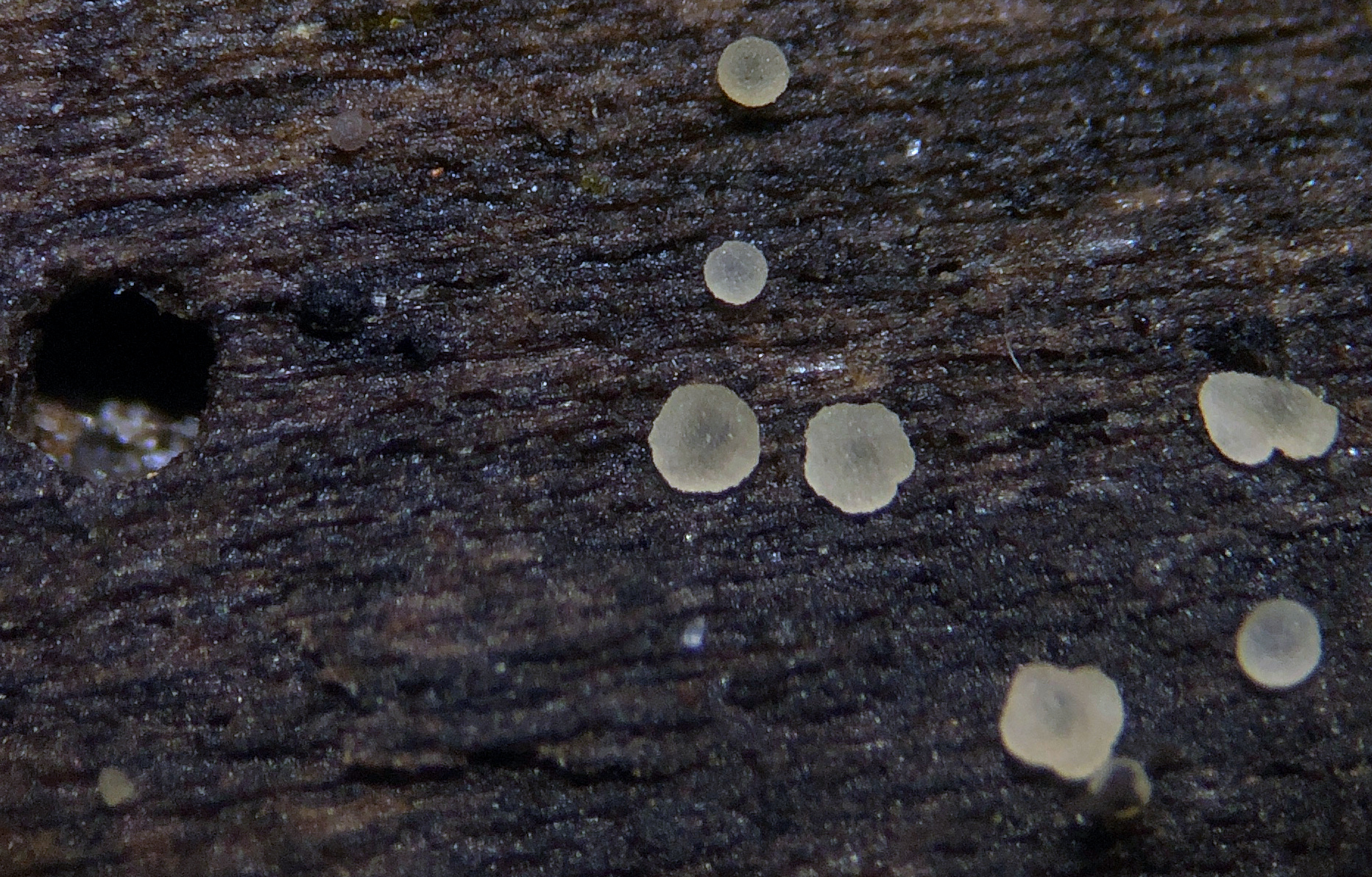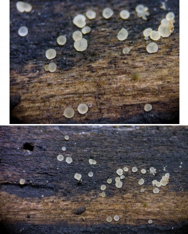 Ascomata: Hyaloscypha minuta-like, gregarious to clustered, superficial, < 0.5 mm diameter (maybe even smaller max), whitish-ochraceous, possibly more yellow with age, translucent, pruinose, some with lumps of orange exudate, initially cupulate to turbinate, then discoid to scutellate-pulvinate, often appearing sessile and appressed in maturity, no clear differentiation between receptacle and disc, occasionally uneven margin in maturity.