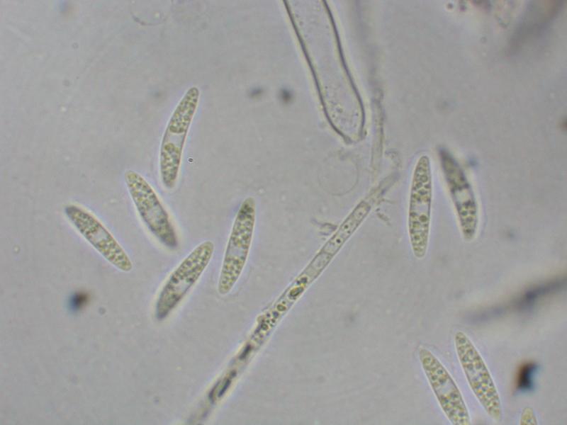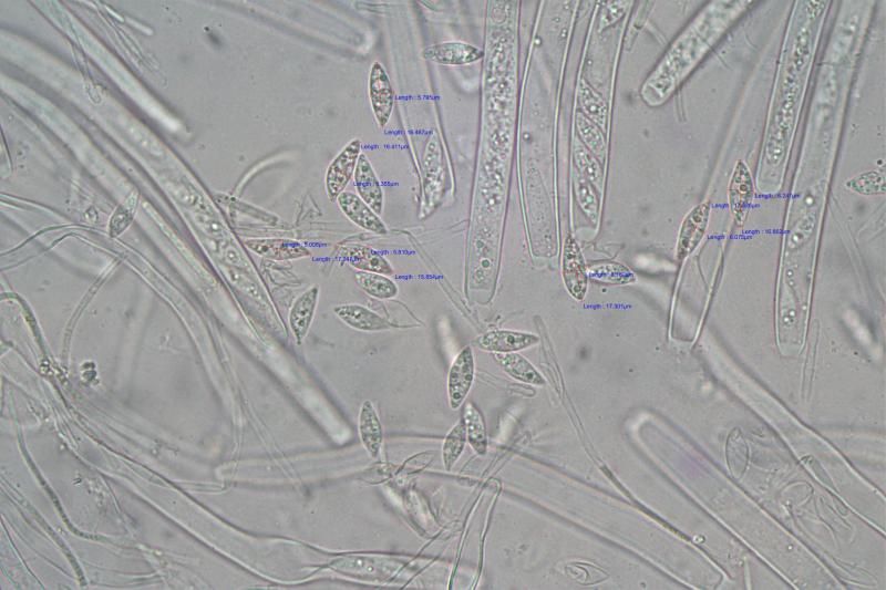 Spores are fusoid with small guttules 15.9-17.2 x 5-6.4um in water and up to 19.2 x 6.1um in KOH