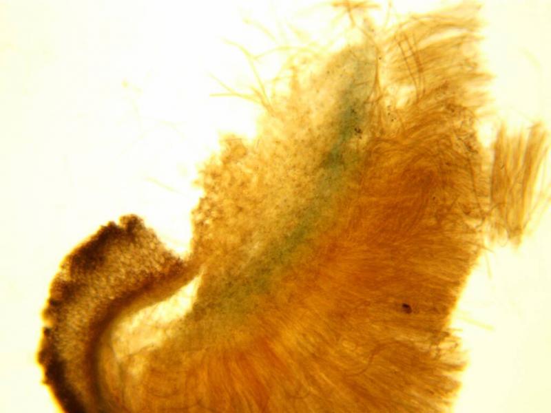 Here is a slightly crushed cut in Lugol and we can observe the blue area.