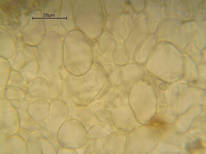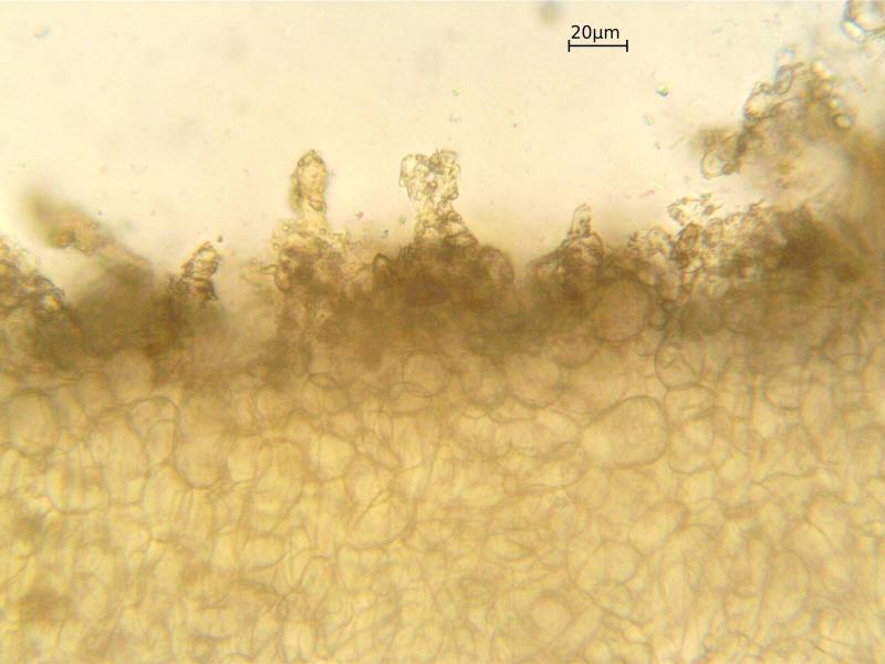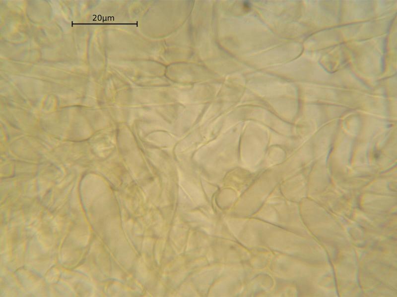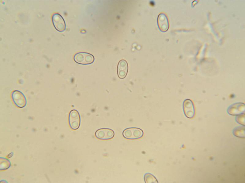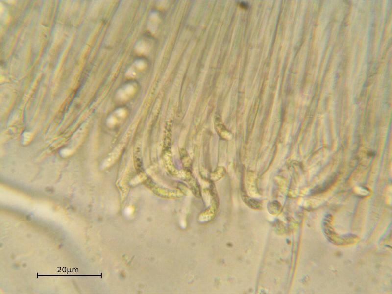 excipulum ectal globosa/angularis, médule sous hyméniale intricata. Les cellules externes sont plus ou moins incrustées. Asques cylindriques non mesurées. paraphyses recourbées, avec des guttules dans la partie sommitale, large de 2-3,7 µm. Spores elliptiques, lisses, biguttulées :