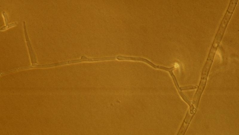 The picture here shows a hypha of Pyxidiophora sp. from seaweed growing from the left side of the picture and attaching on the right to a hypha of Paradendryphiella arenaria. The contact cells are the small round sucker-like structures.