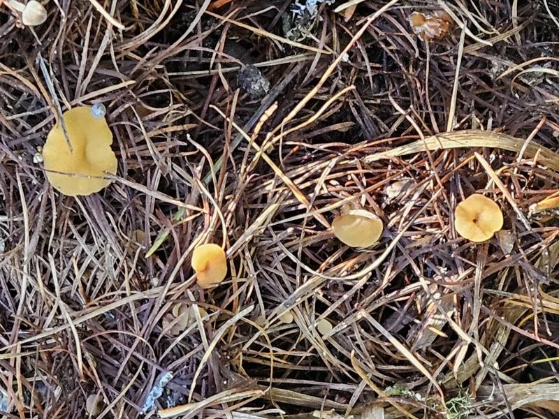 Apothécies brun ocracé avec un stipe très court, 4-9 mm de diamètre, ombiliquées, pas de poils.