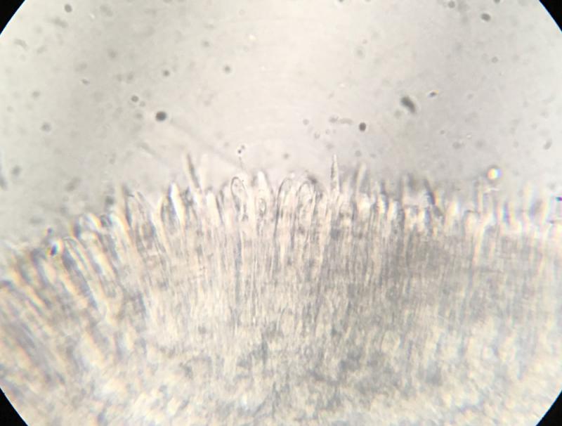 Marginal hairs are septate and have granular roughening on the lower parts, but are smooth at the ends. The ends slightly inflated, up to 3.3µm wide.