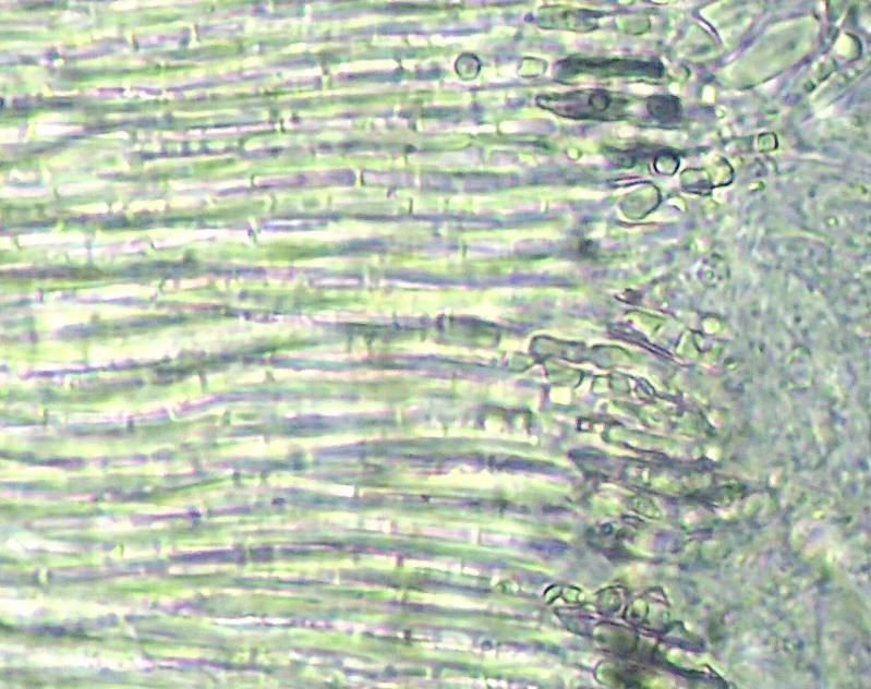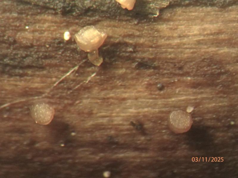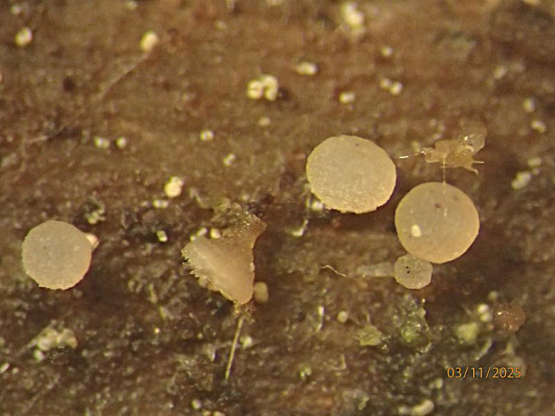 These tiny (0.4-0.5 mm diam.), whitish, short-stipitate apothecia were collected on decorticated log of Populus tremula (estimated to have died and fallen ca. ten years ago) in Oslo. The excipulum and stipes somewhat darker than the hymenium, the entire ascocarps turning brownish upon drying. Asci clearly protruding beyond a dense palisade of rather thick, cylindric, septate paraphyses with large, somewhat refractive bodies in the upper part. Spores ca. 20-25 x 5 micr., somewhat fusiform, aseptate, curved, multiguttulate, biseriate in the upper part of asci. Asci clavate with a long base, without croziers (?), IKI+ (blue ring in Lugol).Microscopically I think of Tatraea sp. Spores similar to T. macrospora, but that species does not occur in Europe (?). Also the apothecia are much smaller than any Tatraea I find in the literature. So I guess I am wrong. Any suggestions? Microscopy done on fresh material in water.