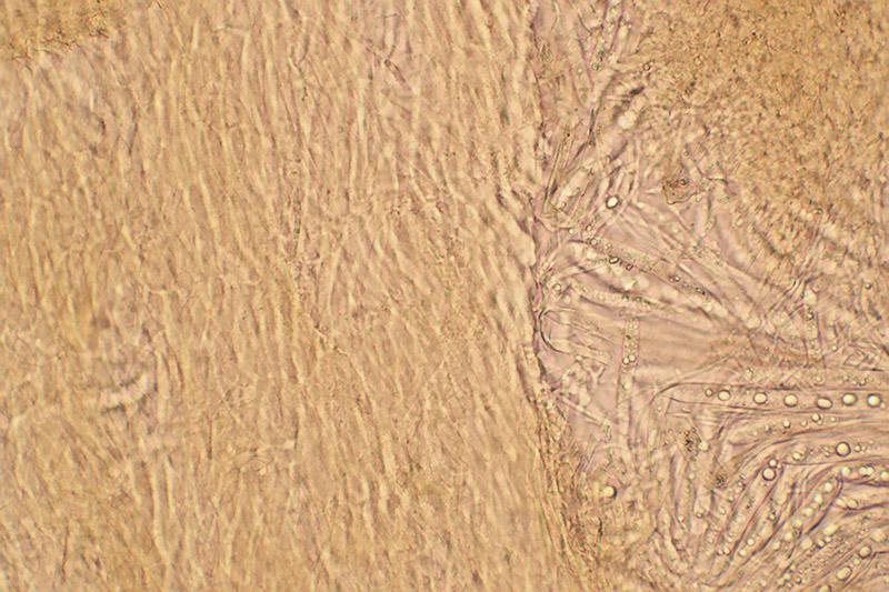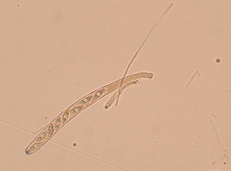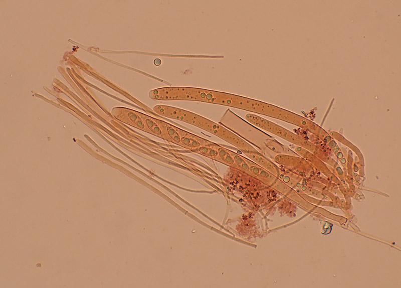 Yesterday I found a fungus on or near a needle, about 5 mm high. It is yellowish when fresh, later brownish with hairy and longitudinally whitish fibers. The spores are on average 16.2 x 6.1 microns. IKI+
