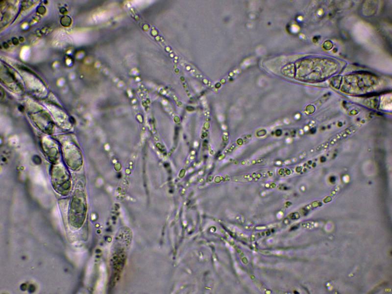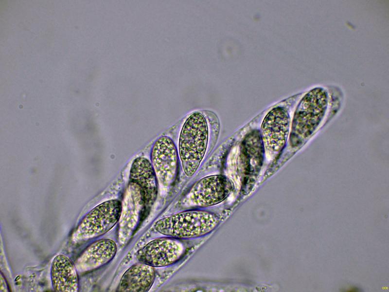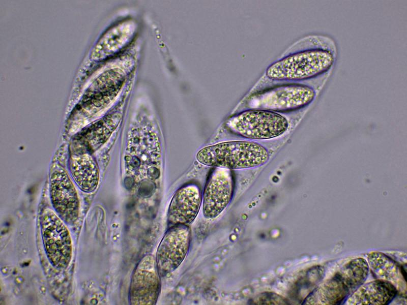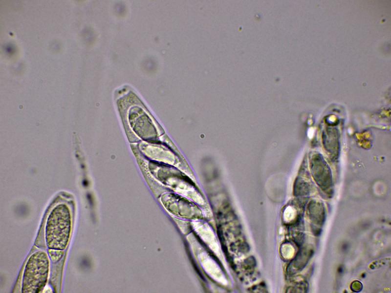 Spores between ellipsoid and fusiform, with one more pointed end and a septum near this end, this septum being more visible using Melzer's reagent. Measurements in water of the mature spores measured within the ascus are: