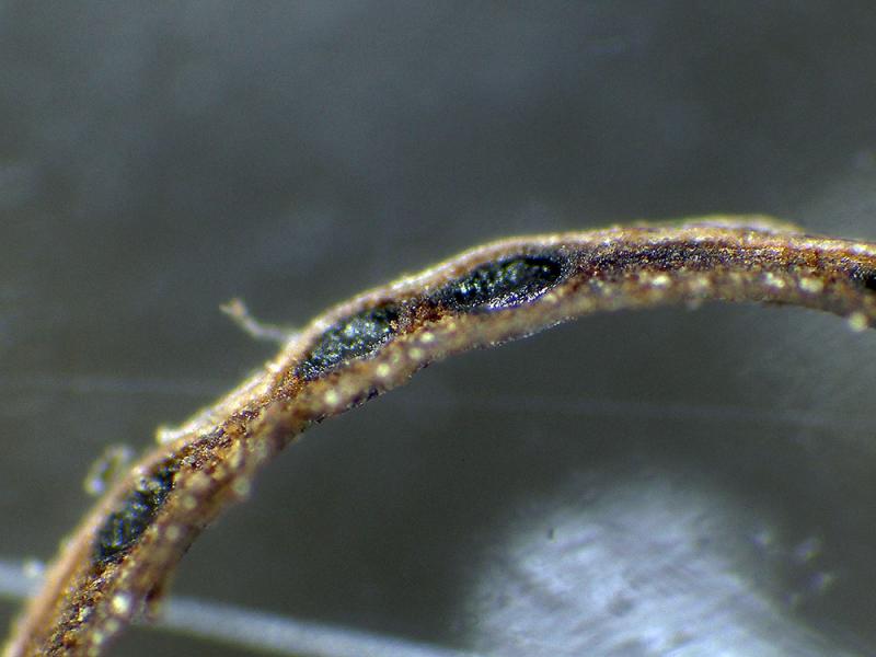 A tiny ascomycete, appearing as erupting grains, barely embedded in the substrate, blackish in color, sprouting sparsely but massively from decomposing soil stems of Rubus sp.