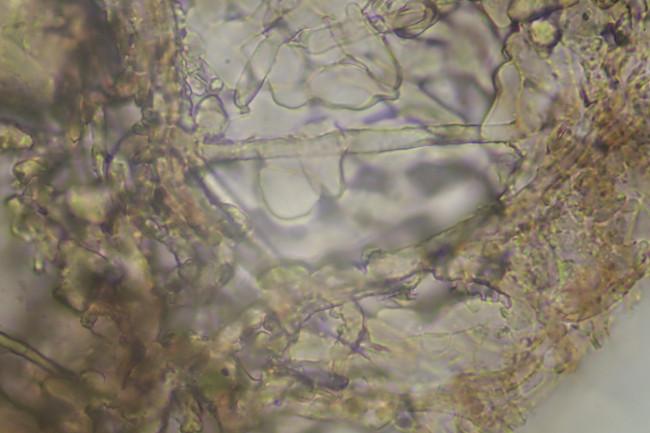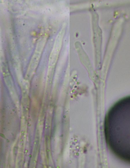 Apothecia 1.5-2.5 mm diam. with raised, entire, light purplish brown margin. Asci 8-spored. Spores ellipsoid, smooth, (15.9) 16-17.6 × (8.6) 9-10 (10.2) um. Paraphyses not inflated, often with thinner finger-like outgrowths on apex, frequently branched at the topmost septum, the top covered with some brownish pigment. Hairs covered with lumps of yellowish brown amorphous pigment.