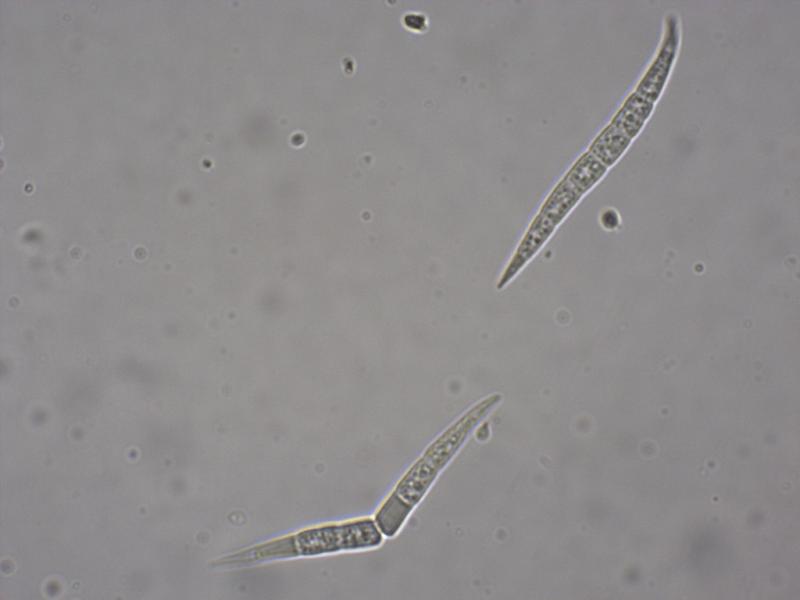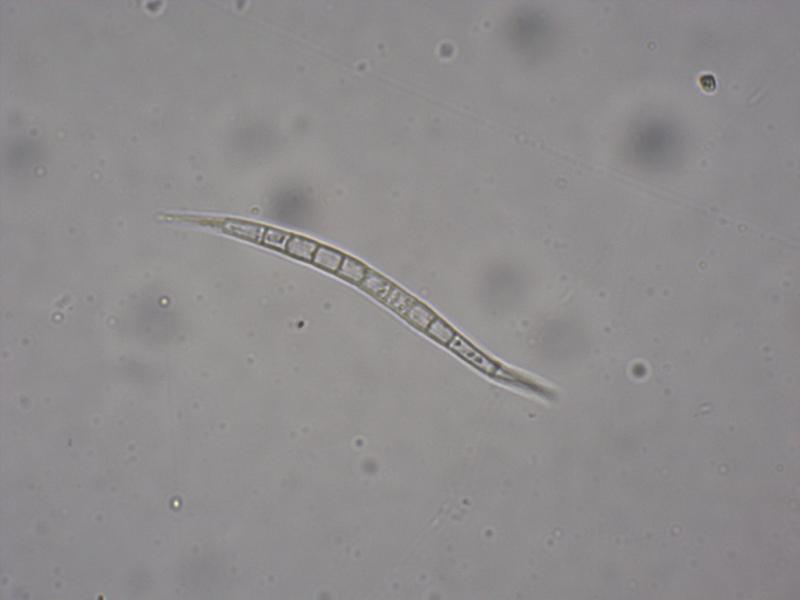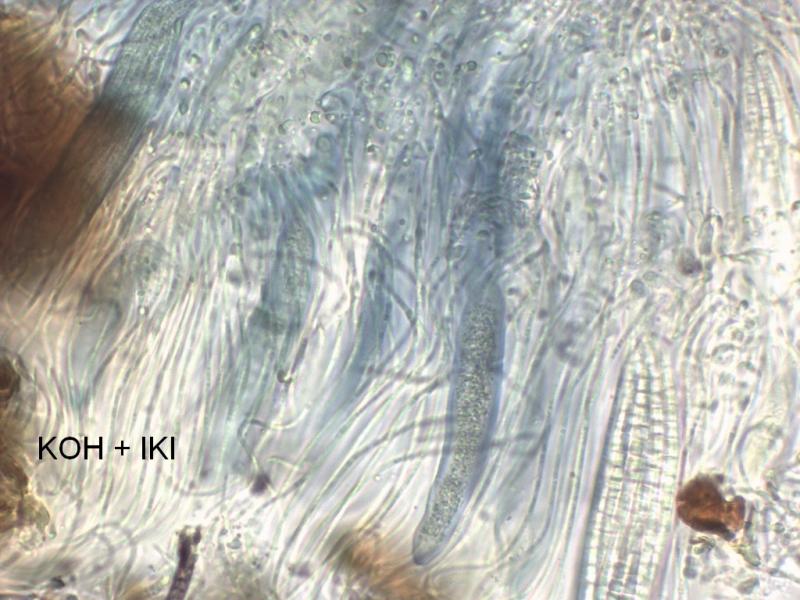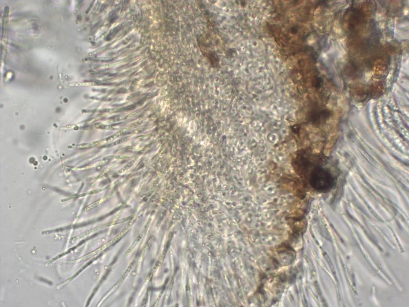 Apothécies de diamètre 0,5 mm environ, érompantes. Hyménium orangé, marge brune épaisse contrastant, rarement dentée. Excipulum à cellules à paroi épaisse, paraissant gélifiée, couche externe ambrée. Asques cylindracés à fusiformes, 68-100 x 18-28 µm, emplis par les spores parallèles, inertes dans IKI, mais la paroi des jeunes asques se colore en bleu dans KOH + IKI. Nombre de spores par asque difficile à évaluer. Paraphyses cylindriques, de diamètre jusqu'à 2 µm, tortueuses, septées, contenant des petites gouttes jaune orangé. Spores longuement fusiformes avec les 2 extrémités acuminées, contenant de nombreuses petites guttules, septées (7 à 14 cloisons, le plus souvent 13), (33)55-82 x 3-4 µm, avec une très légère constriction au niveau des cloisons, plus marquée sur la cloison centrale. On voit parfois des spores brisées en 2 au niveau de la cloison centrale.