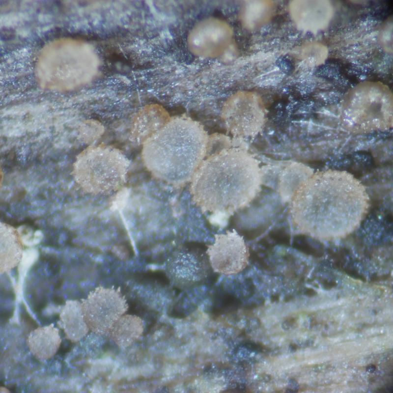 Discus up to 0.25mm, sessile, on the edge somewhat coronat hairy. Excipulum hairy. Hairs multicelled, the outer cells with dark grains on the surface.