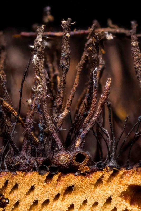 Danny NewmanMelanospora cf. lagenaria on old, rotting, fallen and still attached FBs of conk (possibly Fomes sp.)